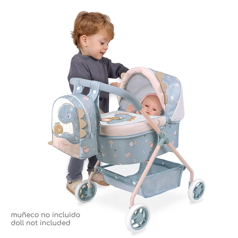 El pack incluye: Carro de muñecas de color gris y blanco con estampado especial de la linea Coco, bandeja inferior de tela portaobjetos, ruedas con cubierta de foam silencioso, manillar acolchado, capazo rígido, capota extensible, bolso para el carro a juego y más detalles de lujo.