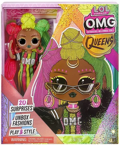 - Desempaqueta 20 sorpresas, incluyendo la muñeca de moda LOL Surprise OMG Queens Sways, moda y accesorios. Sways se trata de bailar. Le encanta levantarse los talones y divertirse con sus BQF (Mejores amigas de la reina).