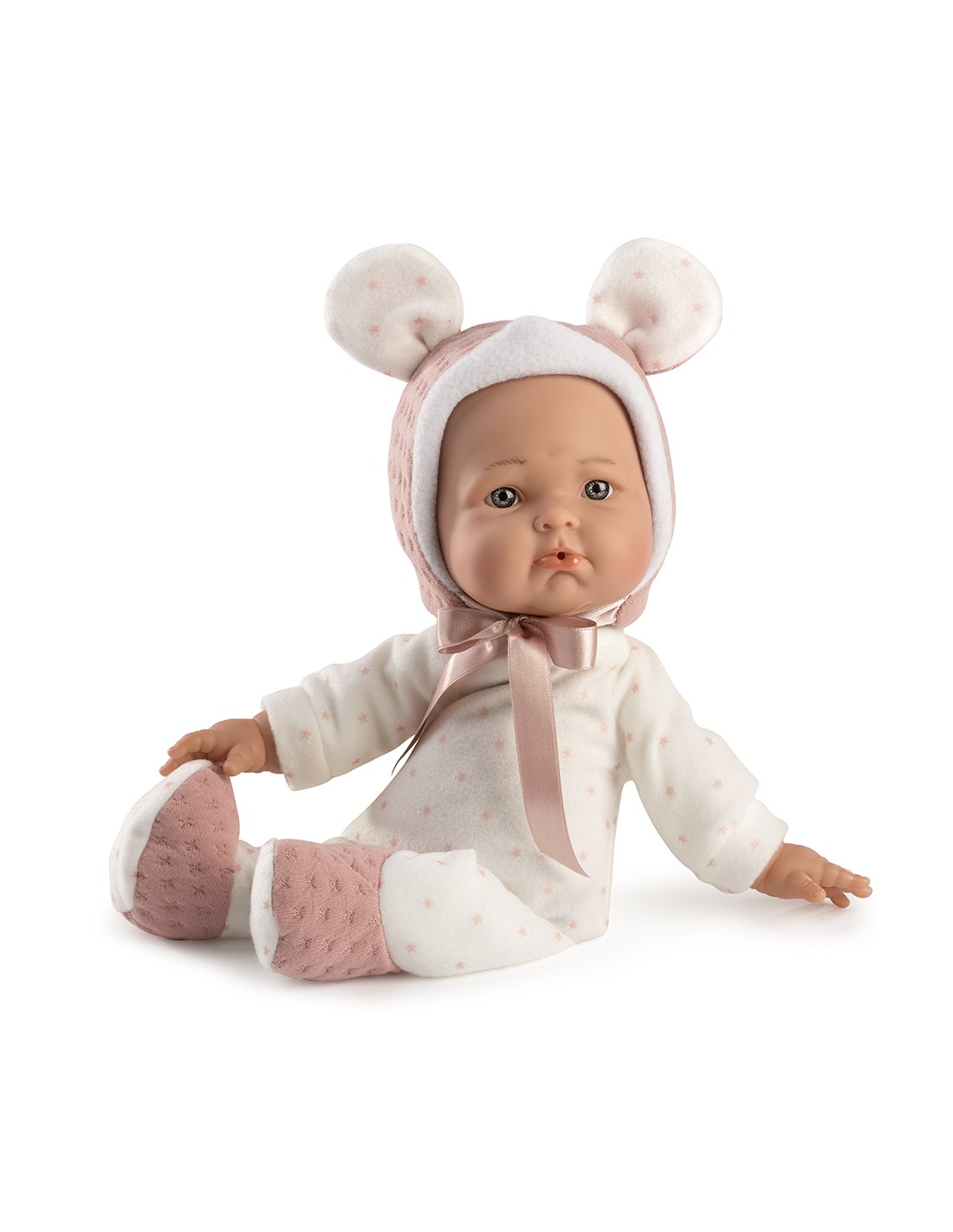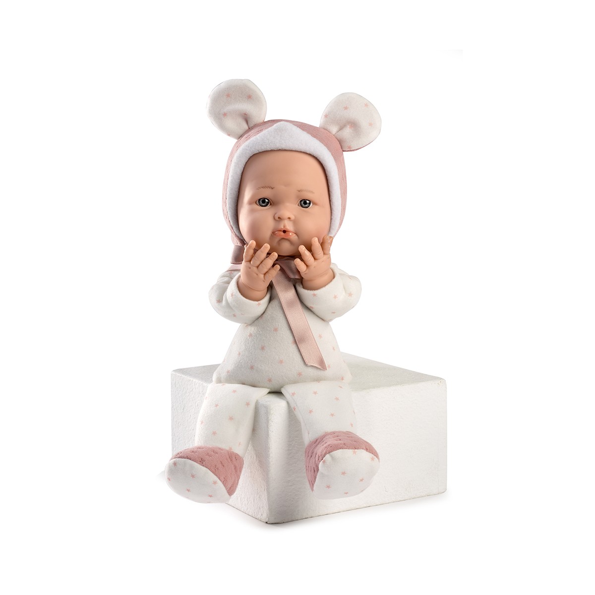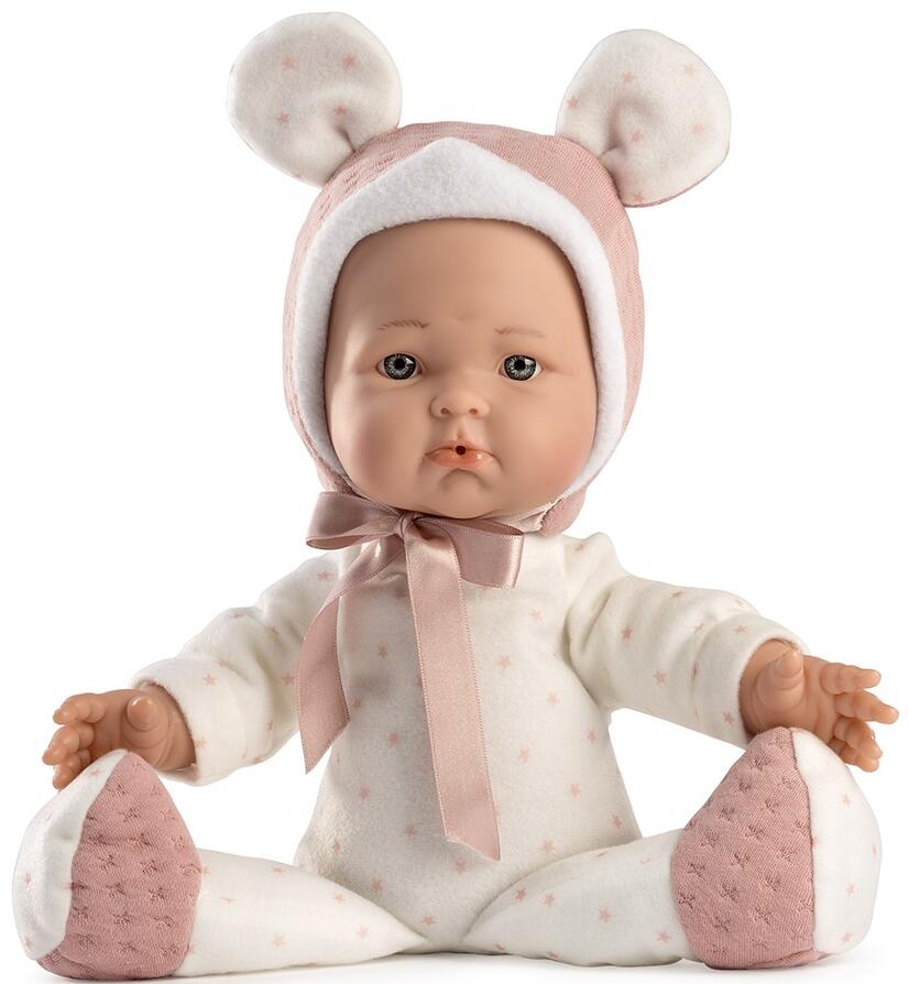Mimi, Mi primer bebé de 36 cm. Su cuerpo es de tela de coralina blanca con corazones rosas, pies de punto rosa y blanco. Gorro de punto rosa con orejas de coralina blanca y corazones rosas.