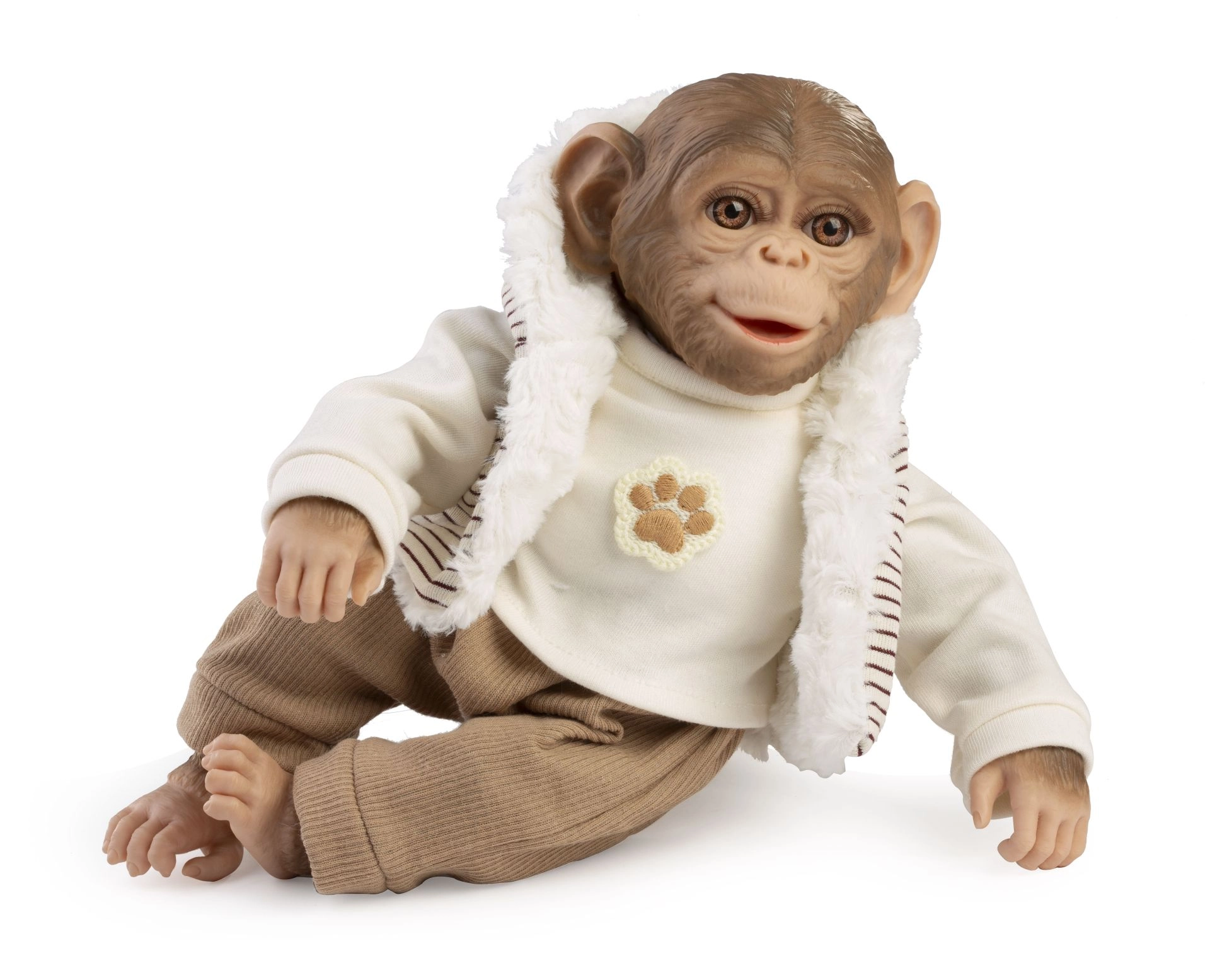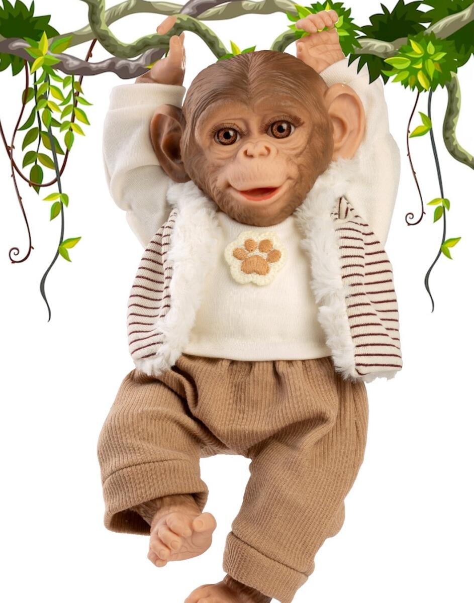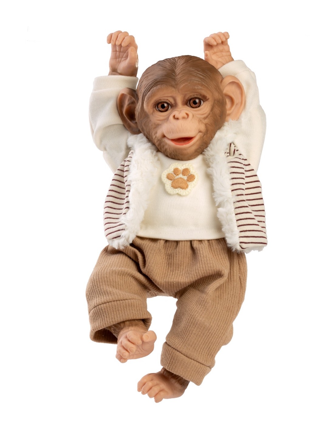 Mono Reborn de 32 cm con cuerpo de tela. Lleva jersey, chaleco de rayas, pantalón marrón y está fabricado en España.