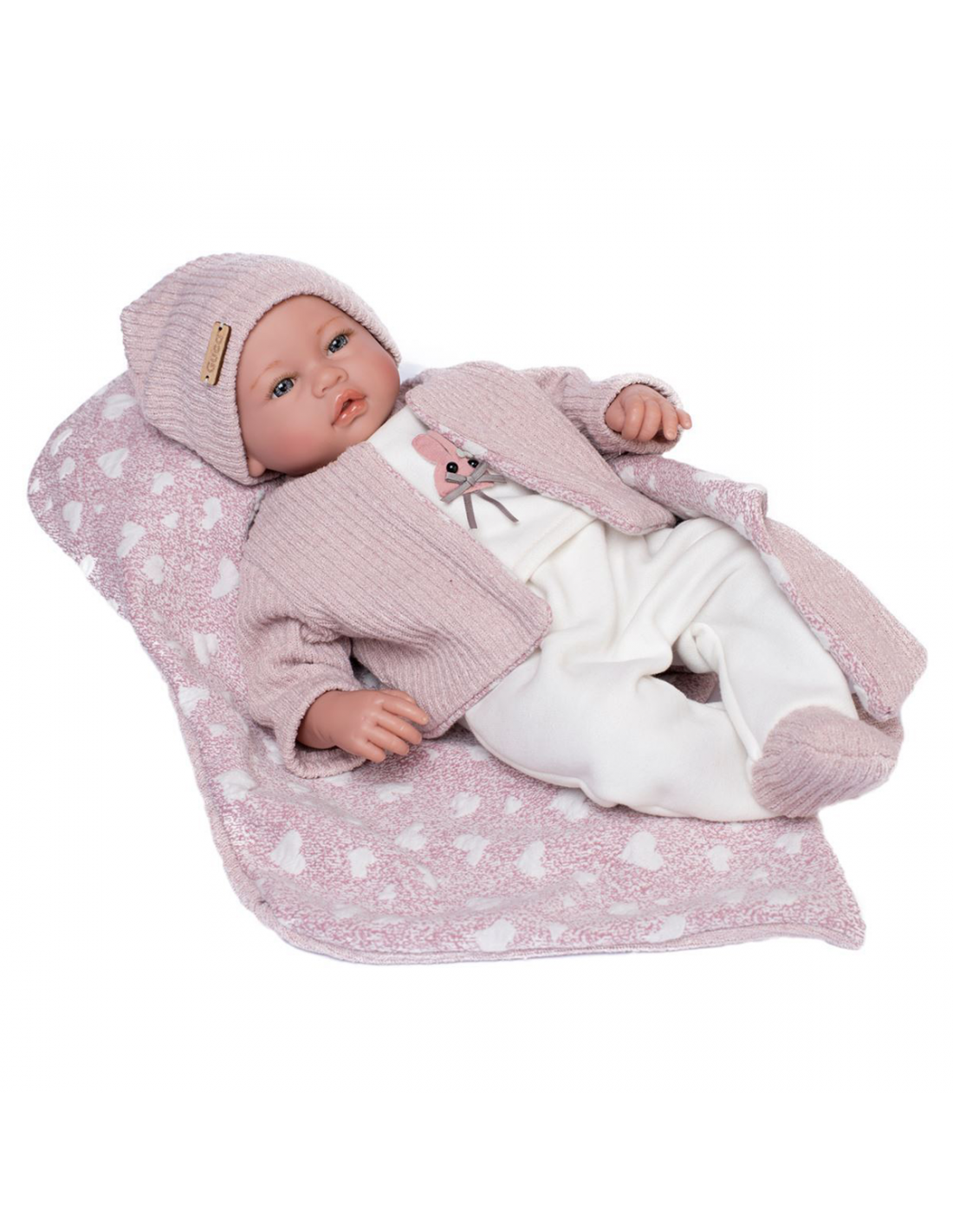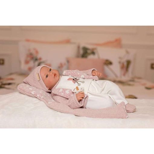 Eva es una muñeca Classic de 46 cm. Lleva conjunto rosa de punto con polaina, gorro con pompón, camiseta blanca y calcetines.