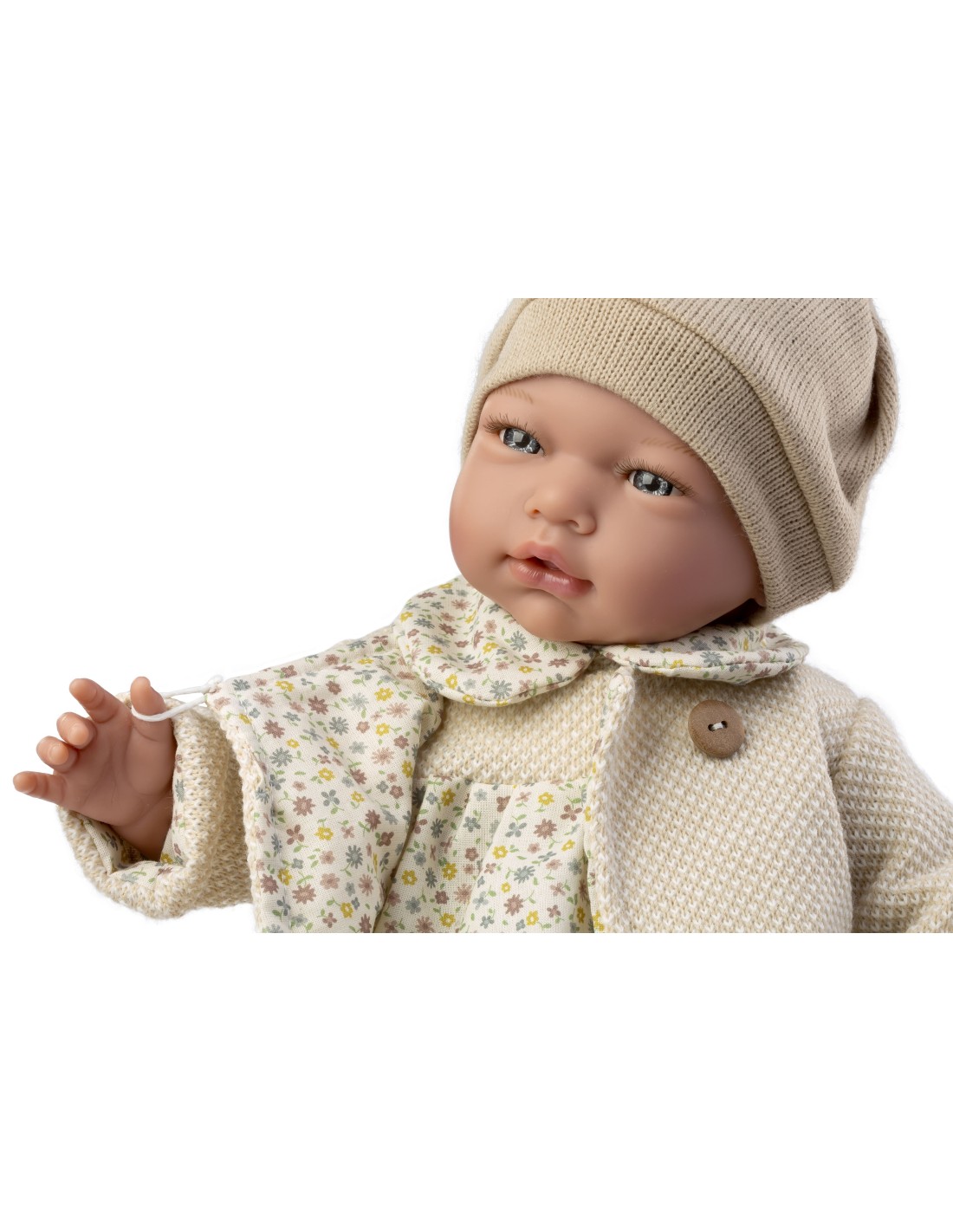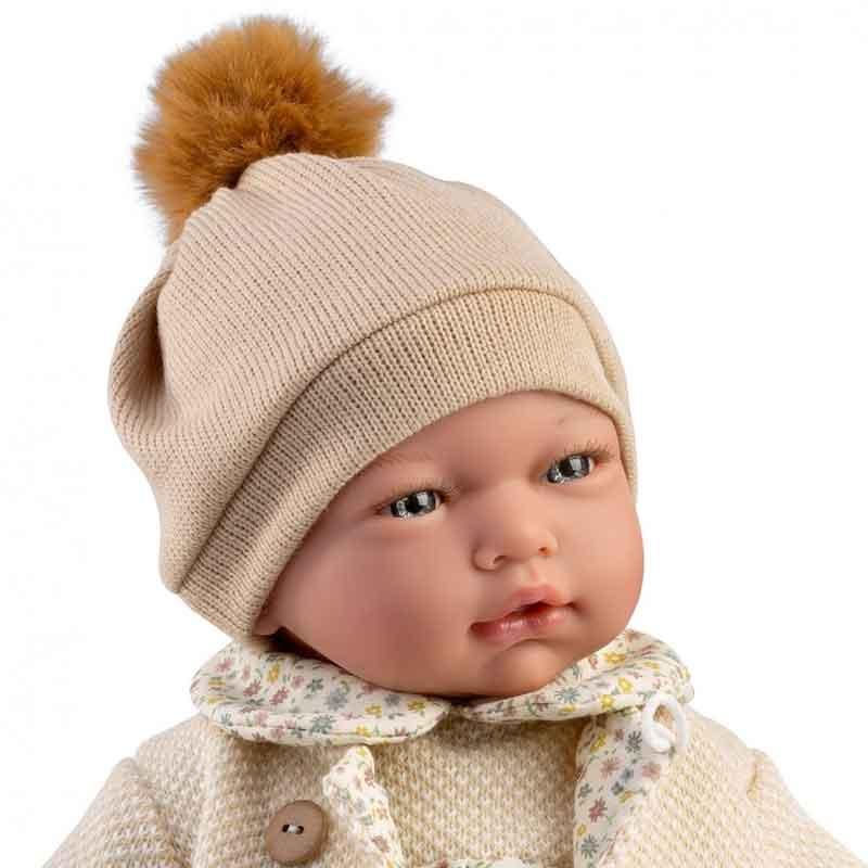 Cris es una muñeca con peso de 42 cm y 1,71 kg. Lleva pelele beig, chaqueta, gorro y calcetines.