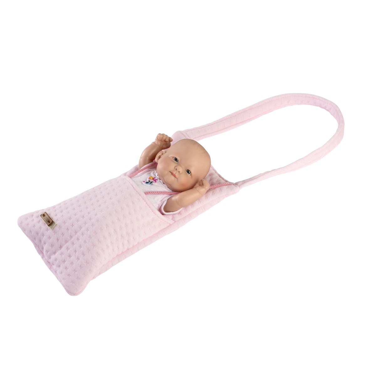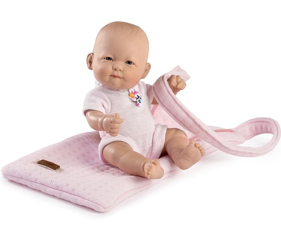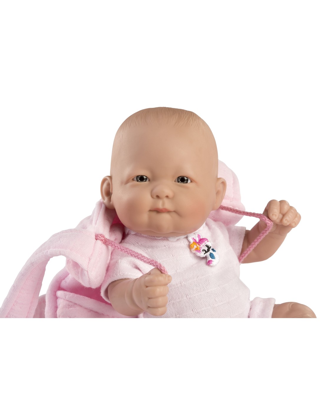 Lisa es una muñeca Recién Nacida de 25 cm. Lleva un body de manga corta de punto rosa.