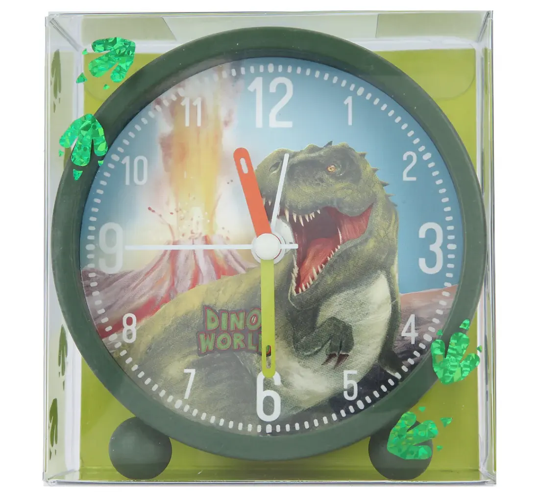 Con el despertador con diseño de Dino World con carcasa de plástico verde claro, levantarse es mucho más fácil. El diseño de dinosaurios recuerda a la selva y hace que el reloj sea un punto culminante en la habitación de los niños. El despertador analógico infantil tictac de forma totalmente silenciosa y por lo tanto no interfiere con el sueño dormido. La esfera con cuatro manecillas es fácil de leer incluso en la oscuridad gracias a la función de luz, pero no demasiado brillante.
